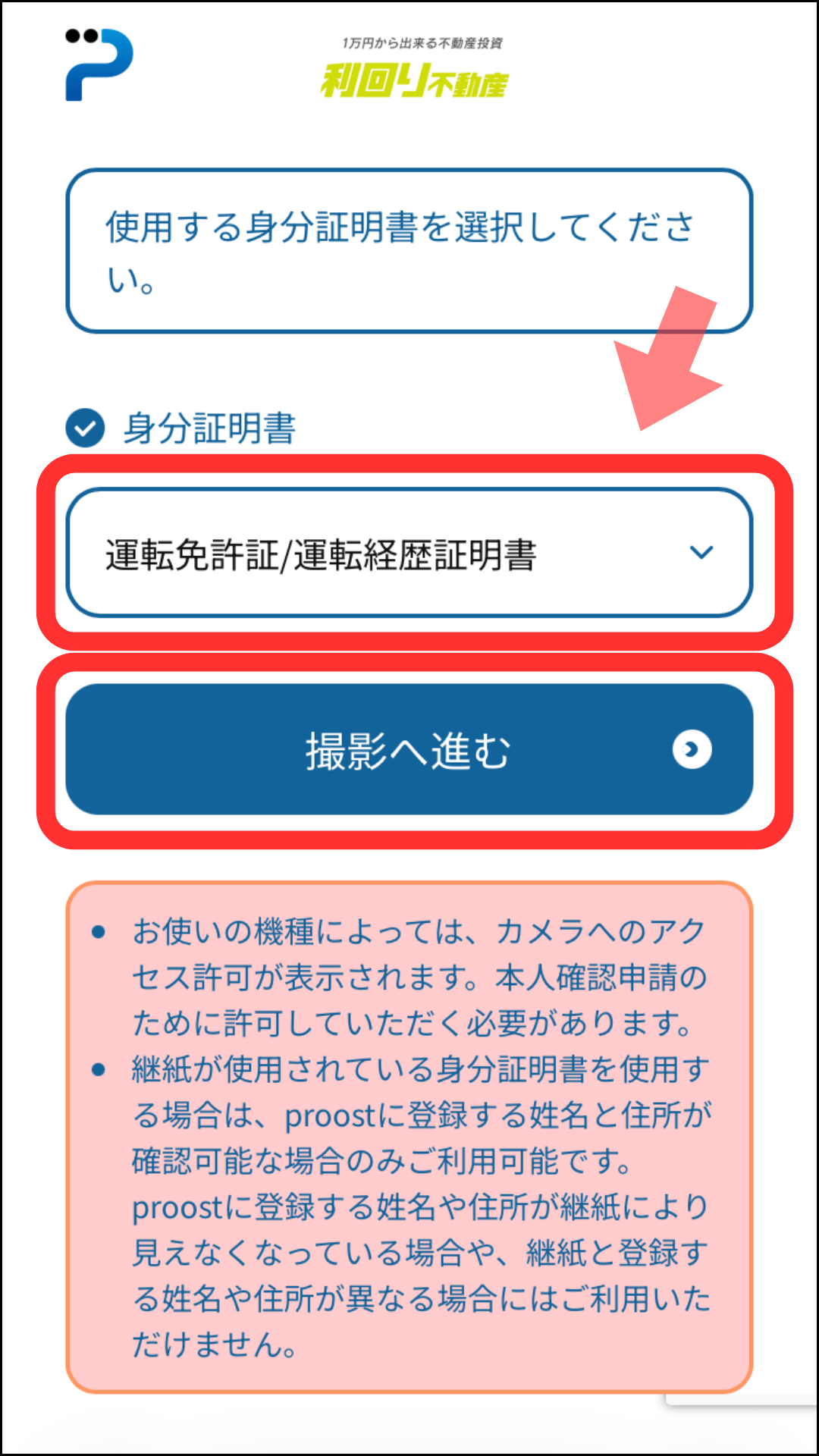 運転免許証やマイナカードなど、本人確認書類を選択し、「撮影へ進む」をタップしてください。あとは画面の指示に従い、本人確認書類と自身の顔写真を撮影します。(2分ほどで終了)