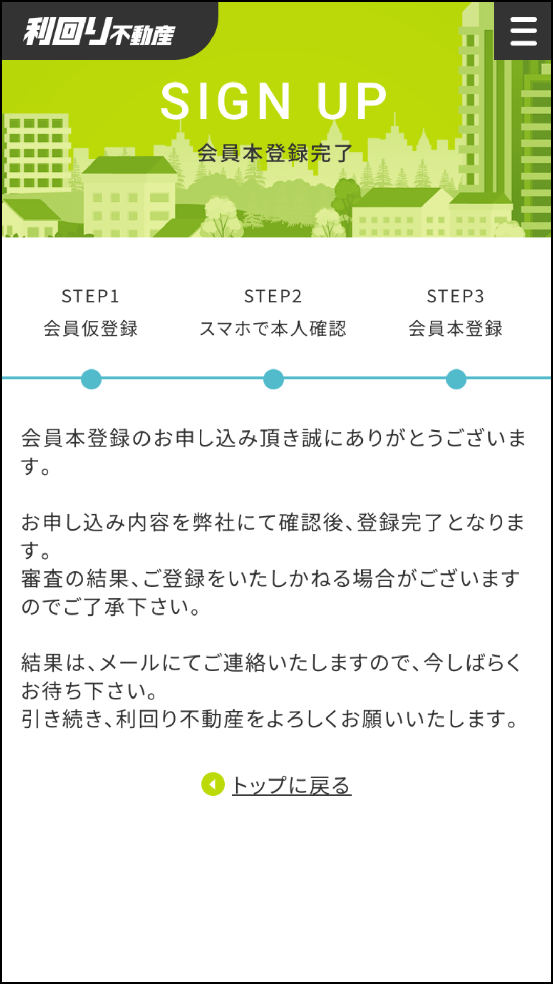 「会員法登録完了」画面が表示されたら完了です。本人確認は早ければその日のうちに結果がメールで届きます。